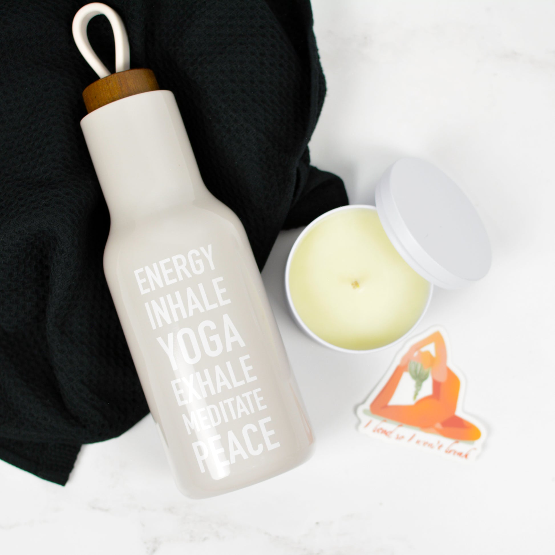 Motivational Water Bottle – A sleek, soft-touch bottle with a wood lid and carry loop, printed with affirmations like Energy, Inhale, Yoga, Peace—a daily reminder to breathe and stay centered.
