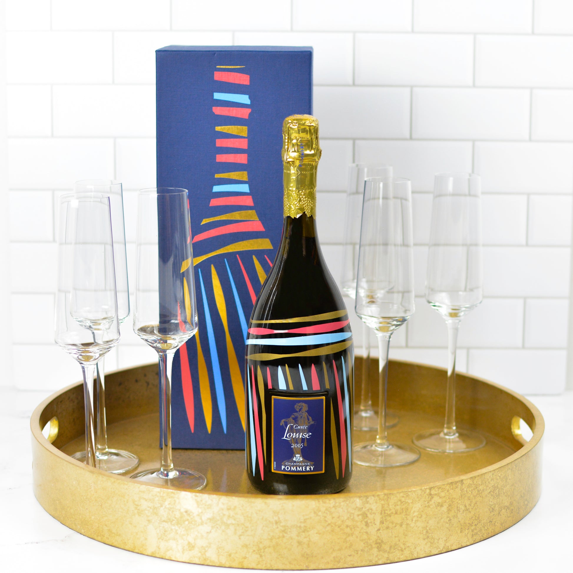 Celebrate in style with the Pommery Cuvée Louise Champagne Celebration Set — an elegant tribute to life’s most unforgettable moments. Featuring the exceptional 2005 Cuvée Louise by Pommery, this limited-edition bottle is dressed in bold, celebratory artwork and housed in a matching gift box that makes a statement before it’s even opened. Paired with six crystal-clear champagne flutes and presented on a luxe gold tray, it’s the perfect centerpiece for weddings, milestone birthdays, or upscale corporate gifting.