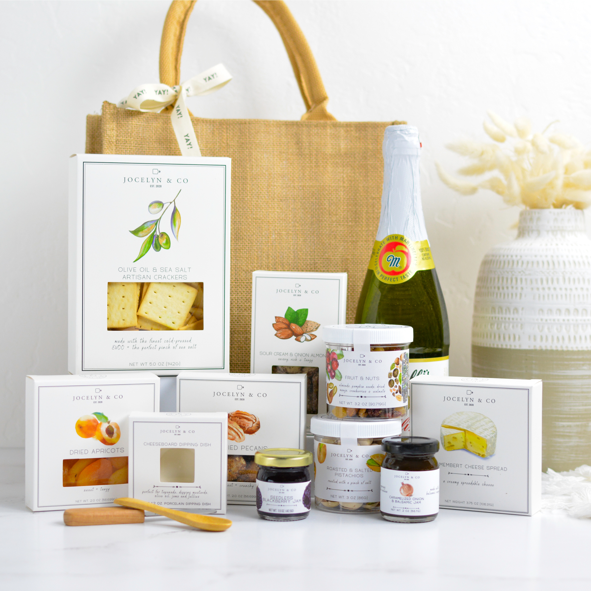 A joyful, generously curated grazing gift designed to celebrate life's happy moments. This celebratory assortment features Jocelyn & Co. favorites including creamy Camembert cheese spread, olive oil and sea salt artisan crackers, roasted pistachios, sour cream and onion almonds, dried apricots, honey, fruit and nut mix, and sweet preserves. Paired with a ceramic cheeseboard dipping dish, wooden spreaders, it offers everything needed for effortless celebrating and sharing.